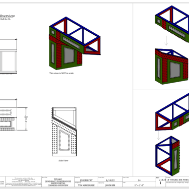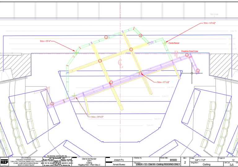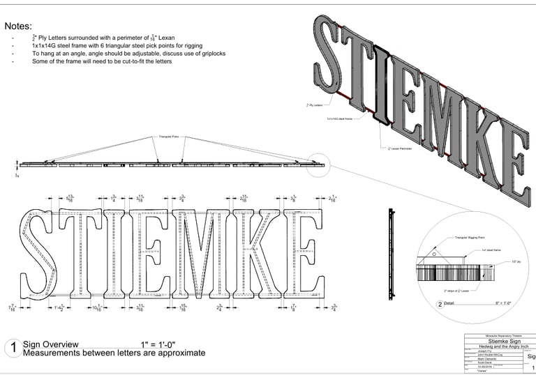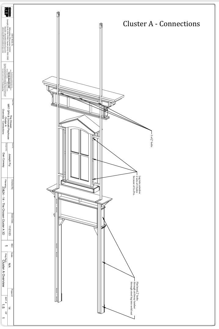 Build Plates I designed and drafted for the entire build including a cieling unit rigged in the air and walls with compounded angles that fit together to form an amorphous 3D shape. Drafted in both 2D and 3D. Fabricated and installed by the IATSE local 18 staff and overhire for the Milwaukee Repertory Theater in Winter'23.